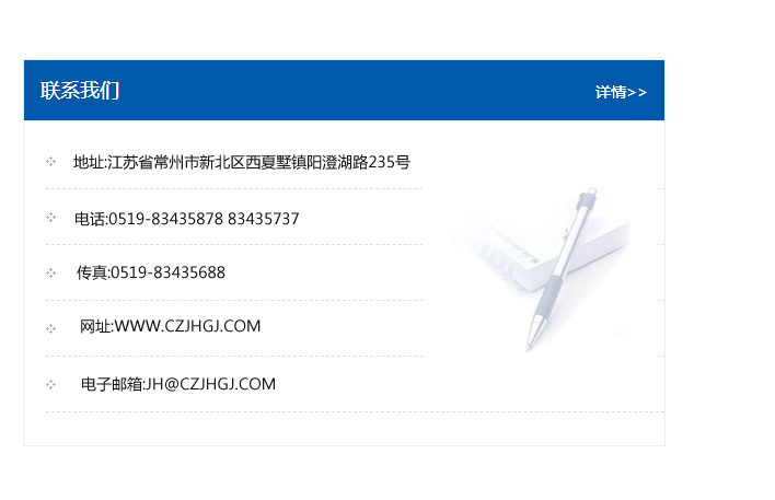 地址:常州市新北區友邦商務大廈1幢16、17層  電話:0519-85101652  傳真:0519-85112595  郵編:213022  網址:www_cz-jiayue_cn.1ksc.com  郵箱:xiajifengaa@163.com